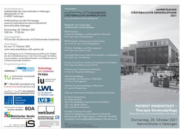 Die Jahrestagung Städtebauliche Denkmalpflege am 28. Oktober 2021 steht unter dem Motto „Patient Innenstadt – Therapie Denkmalpflege? Brauchen wir noch Innenstädte und wozu?“. Mehr…