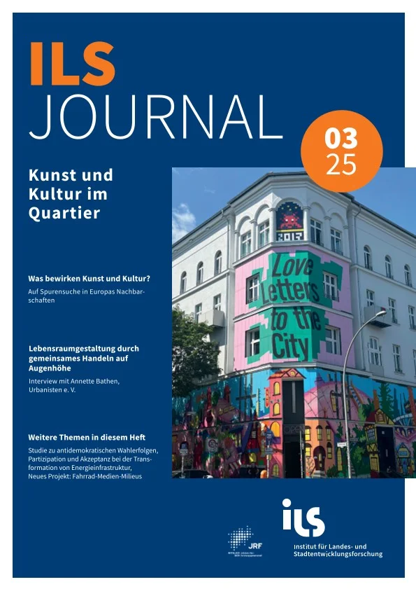 Was bewirken Kunst und Kultur? Das Titelthema des aktuellen ILS-JOURNAL 03/25 begibt sich auf die Suche in Europas Nachbarschaften. Das Projekt STARTUP wird vorgestellt, an dem das ILS beteiligt ist. Es untersucht die Wirkung von Kultur und Kreativwirtschaft auf einzelne Stadtteile, auf die Stadtregionen, und auch auf Europa als Ganzes. Annette Bathen berichtet im Interview von ihrer Praxiserfahrung als Vorstandsmitglied des Vereins Urbanisten e. V. in Dortmund. Dort begleitet sie seit Jahren Menschen dabei ihre Nachbarschaft eigenständig kreativ zu gestalten. Neben diesem Schwerpunktthema werden neue Projekte und Projektergebnisse vorgestellt. Kurznachrichten und Personalia-Meldungen berichten von Ereignissen und Veränderungen im ILS.